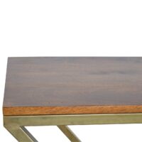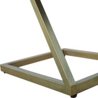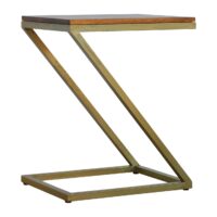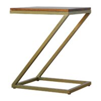 The side table works the on-trend industrial look with understated charm. The top of the side table is constructed from 100% solid mango wood and the base/leg is made from 100% iron. Other features include a fine, smooth oak-ish finish top and a beautiful gold finish on the base. Adding another dimension to its character is its distinctive Z-shaped figure, resulting in a more streamlined look, but maintaining a solid structure.