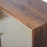 Draw attention to the bedroom with our Zen Sideboard. Its decorative brass doors front feature a striking cut-out dotted pattern which is perfectly combined with the chestnut finish. It also features shiny brass knobs and nordic-style legs. Perfect for adding an Art Deco feel to the home.